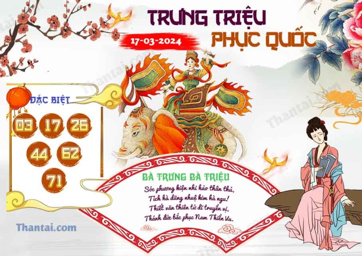 Thư viện kho tàng dự đoán xổ số lớn nhất miền Bắc Việt Nam xin đưa ra dự đoán XSMB chủ nhật ngày 17/03/2024, Trưng Triệu Phục Quốc soi cầu MB 17/03/2024 chính xác nhất chỉ có tại Thantai.gg. Anh em có thể tham khảo để dành chiến thắng cho ngày 17/03/2024.