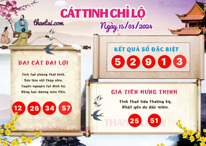 Chốt số CÁT TINH CHỈ LỘ dự đoán XSMB thứ 6 ngày 15/03/2024, CÁT TINH CHỈ LỘ chia sẻ số đẹp miền Bắc ngày 15/03/2024 dễ trúng nhất. Anh em có thể tham khảo để dành chiến thắng cho ngày 15/03/2024.