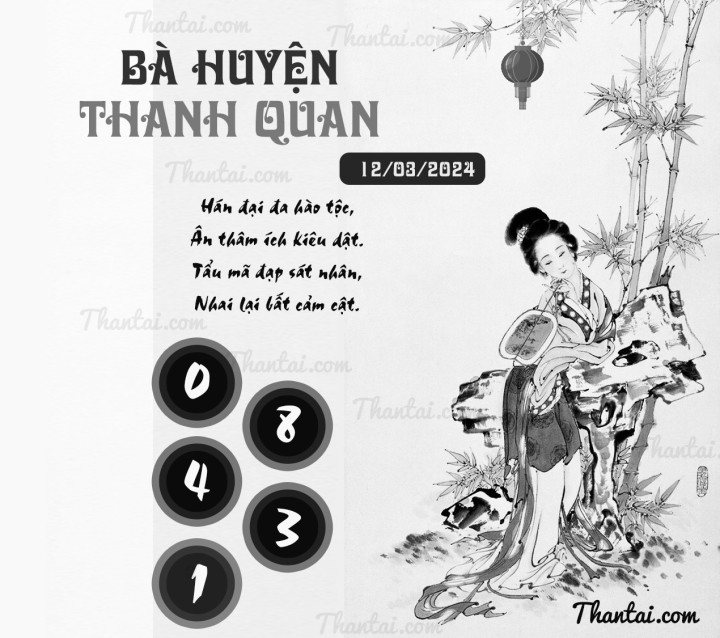 BÀ HUYỆN THANH QUAN dự đoán dàn đề xổ số miền Bắc thứ 3 ngày 12/03/2024, BÀ HUYỆN THANH QUAN soi cầu Ngũ hành tốt xấu hôm nay 12/03/2024 may mắn nhất. Anh em có thể tham khảo để dành chiến thắng cho ngày 12/03/2024.