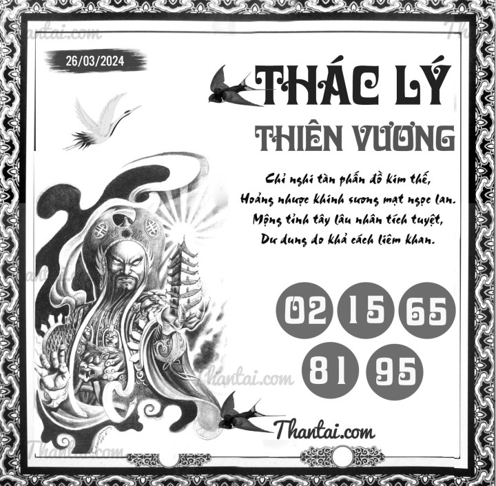 THÁC LÝ THIÊN VƯƠNG dự đoán dàn đề xổ số miền Bắc thứ 3 ngày 26/03/2024, THÁC LÝ THIÊN VƯƠNG soi cầu Ngũ hành tốt xấu hôm nay 26/03/2024 may mắn nhất. Anh em có thể tham khảo để dành chiến thắng cho ngày 26/03/2024.
