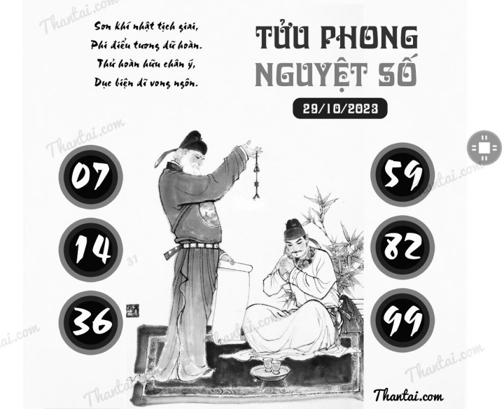 Thư viện kho tàng dự đoán xổ số lớn nhất miền Bắc Việt Nam xin đưa ra dự đoán XSMB chủ nhật ngày 29/10/2023, TỬU PHONG NGUYỆT SỐ soi cầu MB 29/10/2023 chính xác nhất chỉ có tại Thantai.gg. Anh em có thể tham khảo để dành chiến thắng cho ngày 29/10/2023.